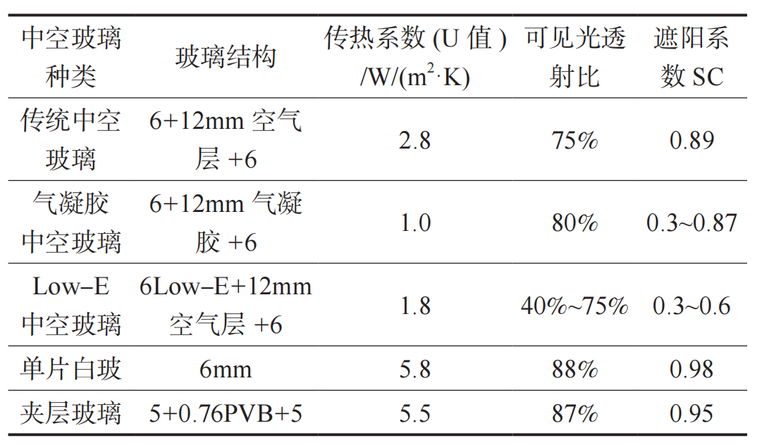 基于以上優(yōu)點,將氣凝膠填充于中空玻璃中間,替代空氣隔熱,形成氣凝膠中空玻璃。與傳統(tǒng)中空玻璃相比,氣凝膠中空玻璃采光性能好、傳熱系數(shù)低、保溫隔熱性能優(yōu)異。各種建筑玻璃的光熱性能見表1。
