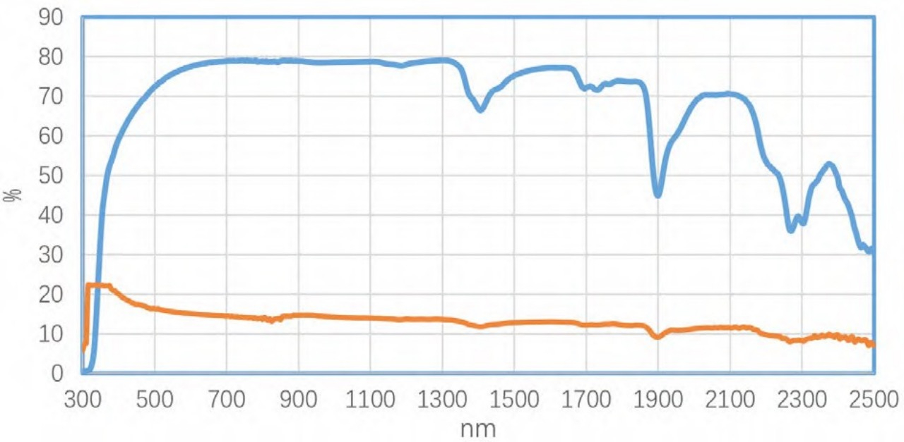采用PE公司的Lambda950分光光度計分別測試氣凝膠玻璃在300~2500nm范圍內(nèi)透射、反射光譜曲線,如圖5所示。