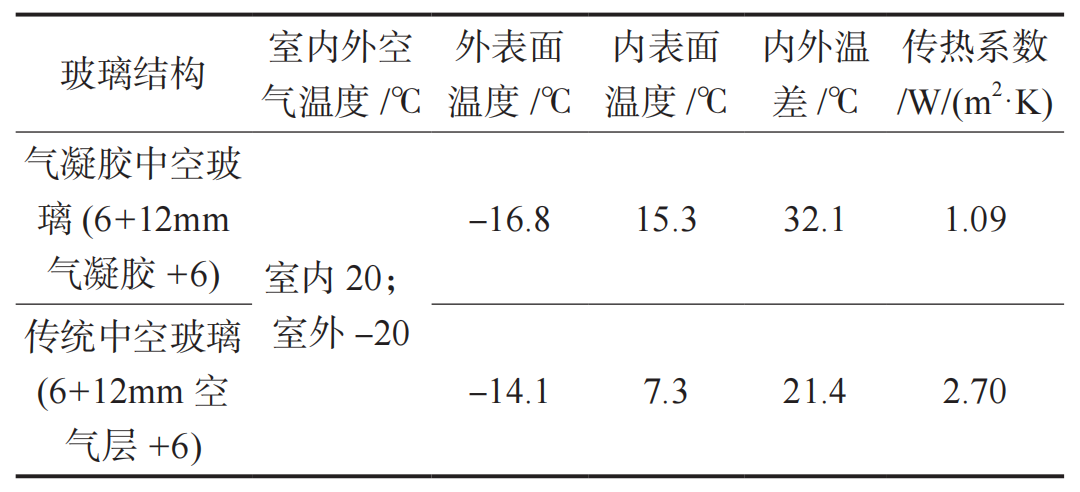 采用美國勞倫斯伯克利的Window及Therm軟件進行玻璃系統(tǒng)有限元傳熱分析。本文的環(huán)境條件為室外溫度-20℃,室內(nèi)溫度20℃;對比對象為6mm玻璃+12mm空氣層+6mm玻璃及6mm玻璃+12mm氣凝膠+6mm玻璃,對比結(jié)果見圖4。