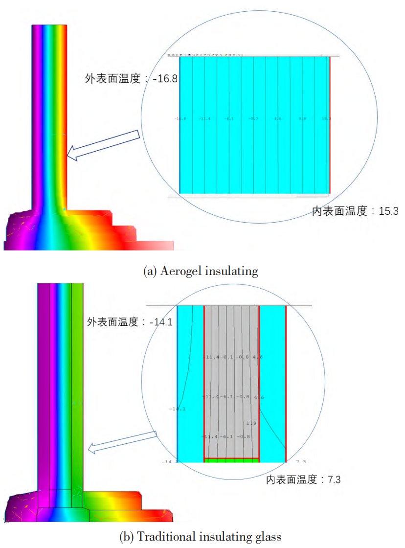 圖 4 氣凝膠中空玻璃、傳統(tǒng)中空玻璃有限元傳熱分析
