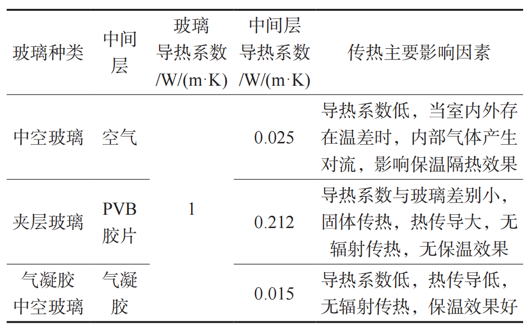 從產(chǎn)品結(jié)構(gòu)分析,氣凝膠玻璃是介于中空玻璃與夾層玻璃之間的一種新型玻璃產(chǎn)品,都由兩層玻璃構(gòu)成,但中間填充物質(zhì)不同,見圖2。因中間層材料不同,玻璃系統(tǒng)的保溫隔熱效果有很大差異,主要參數(shù)及影響因素見表2。