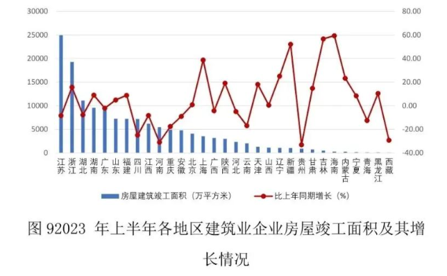 2023年上半年,江蘇、浙江、湖北建筑業(yè)企業(yè)房屋建筑竣工面積均超過1億平方米,分別達(dá)到2.49億平方米、1.93億平方米、1.11億平方米。房屋建筑竣工面積超過5000萬平方米的還有湖南、廣東、山東、福建、四川、江西、河南等7個(gè)地區(qū)。海南、吉林、新疆3個(gè)地區(qū)的房屋建筑工面積增幅均超過了50%,上海、遼寧、內(nèi)蒙古的增幅也都超過了20%。14個(gè)地區(qū)房屋建筑竣工面積出現(xiàn)負(fù)增長,其中貴州、河南、西藏、四川的負(fù)增長均超過 25%(圖9)。