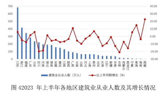 2023年上半年,全國建筑業(yè)從業(yè)人數(shù)超過百萬的地區(qū)仍然是13個(gè)。江蘇、浙江依然是從業(yè)人數(shù)大省,人數(shù)分別達(dá)到684.97萬人和 416.60萬人。福建、廣東、山東、四川等4省從業(yè)人數(shù)均超過200萬人。與上年同期相比,10個(gè)地區(qū)的從業(yè)人數(shù)增加,其中增加人數(shù)最多的是江蘇,增加37.87萬人;18個(gè)地區(qū)的從業(yè)人數(shù)減少,其中減少最多的是四川,減少55.00萬人。從業(yè)人數(shù)增幅最大的是西藏,增幅為22.71%;降幅最大的是吉林,下降了21.05%(圖4)。