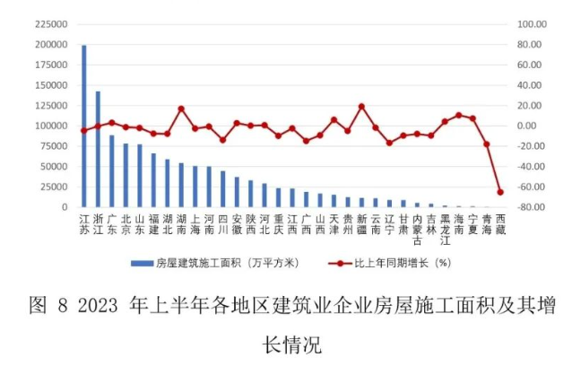 2023年上半年,江蘇、浙江建筑業(yè)企業(yè)房屋建筑施工面積均超過10億平方米,分別達(dá)到19.90億平方米、14.27億平方米。房屋建筑施工面積超過5億平方米的還有廣東北京、山東、福建、湖北、湖南、上海、河南等8個(gè)地區(qū)房屋建筑施工面積同比增長最快的是新疆,達(dá)到了19.10%,湖南、海南的增幅也都超過了10%。21個(gè)地區(qū)房屋建筑施工面積出現(xiàn)負(fù)增長,其中西藏的負(fù)增長超過了65%,青海、遼寧、廣西、四川的負(fù)增長均超過10%(圖8)。