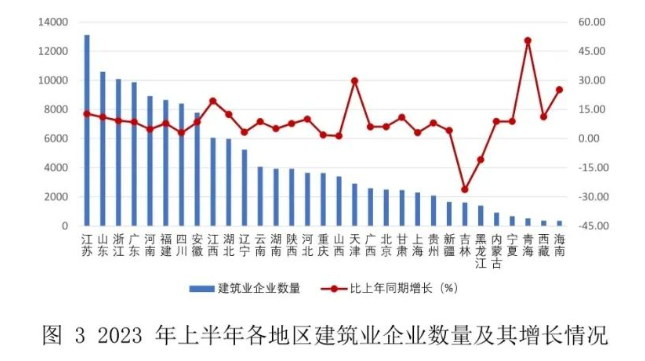 2023年上半年,全國建筑業(yè)企業(yè)數(shù)量超過5000家的地區(qū)共11個(gè)。其中,江蘇的企業(yè)數(shù)量最多,達(dá)到13104家。山東、浙江和廣東的企業(yè)數(shù)量均超過1萬家。與上年同期相比,29個(gè)地區(qū)的企業(yè)數(shù)量增加,其中,青海增速超過50%,天津、海南的增速均超過25%;吉林、黑龍江2個(gè)地區(qū)的企業(yè)數(shù)量減幅超過10%(圖3)。