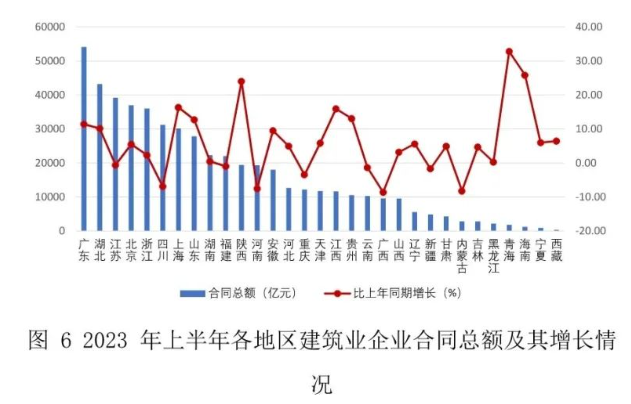 2023年上半年,廣東、湖北、江蘇、北京、浙江、四川、上海等7個(gè)地區(qū)建筑業(yè)企業(yè)合同總額均超過30000億元,分別達(dá)到54142.75億元、43200.05億元、39176.44 億元、37001.58億元、36004.49億元、31243.04億元和30146.28億元。合同總額超過20000億元的還有山東、湖南、福建3個(gè)地區(qū)。合同總額同比增長最快的是青海,達(dá)到了32.80%。海南、陜西、上海和江西的增幅也都超過了15%。9個(gè)地區(qū)合同總額出現(xiàn)負(fù)增長,其中廣西、內(nèi)蒙古的負(fù)增長均超過8%(圖6)。