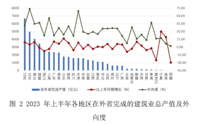 2023 年上半年,江蘇、北京、湖北3個(gè)地區(qū)在外省完成的建筑業(yè)總產(chǎn)值均超過4000億元,分別為6670.07億元、4962.70億元和4046.51億元。這3個(gè)地區(qū)在外省完成產(chǎn)值之和占全部在外省完成產(chǎn)值的比重為34.30%。福建、浙江、上海、廣東、湖南、山東、陜西、四川、天津、河南等10個(gè)地區(qū),在外省完成的建筑業(yè)總產(chǎn)值均超過1500億元。2023年上半年,17個(gè)地區(qū)在外省完成的建筑業(yè)總產(chǎn)值同比有所增長,增長最快的是寧夏,達(dá)到了29.81%。海南、山東的增幅也都超過了15%。從外向度(即本地區(qū)在外省完成的產(chǎn)值占本地區(qū)建筑業(yè)總產(chǎn)值的比例)來看,排在前三位的地區(qū)仍然是北京、天津和上海,分別為73.32%、69.42% 和55.80%。外向度超過30%的還有青海、福建、湖北、江蘇、陜西內(nèi)蒙古、湖南、貴州、遼寧、山西、河北等11個(gè)地區(qū)(圖2)。