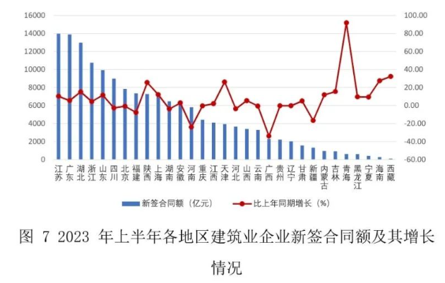 2023年上半年,江蘇、廣東、湖北、浙江四省建筑業(yè)企業(yè)新簽合同額均超過10000億元,分別達(dá)到13974.12億元、13882.98億元、12964.71億元和10731.51億元。新簽合同額超過6000億元的還有山東、四川、北京、福建、陜西、上海、湖南、安徽等8個(gè)地區(qū)。新簽合同額同比增長最快的是青海,達(dá)到了91.68%。西藏、海南、天津、陜西、吉林、湖北、上海、內(nèi)蒙古、山東、江蘇的增幅也都超過了10%。12個(gè)地區(qū)新簽合同額出現(xiàn)負(fù)增長,其中廣西、河南、新疆的負(fù)增長均超過15%(圖7)。